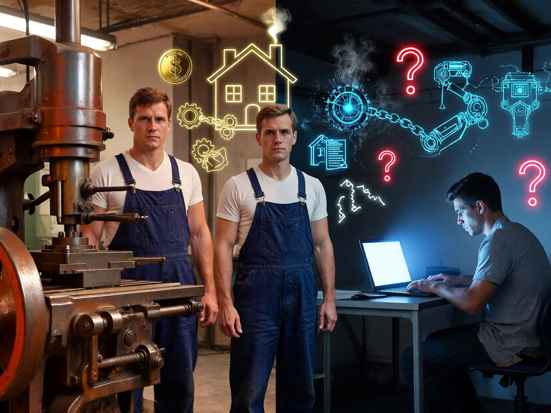 Factory worker, 2020s → automation or relocation risk; must reskill into maintenance, programming, or a new role.